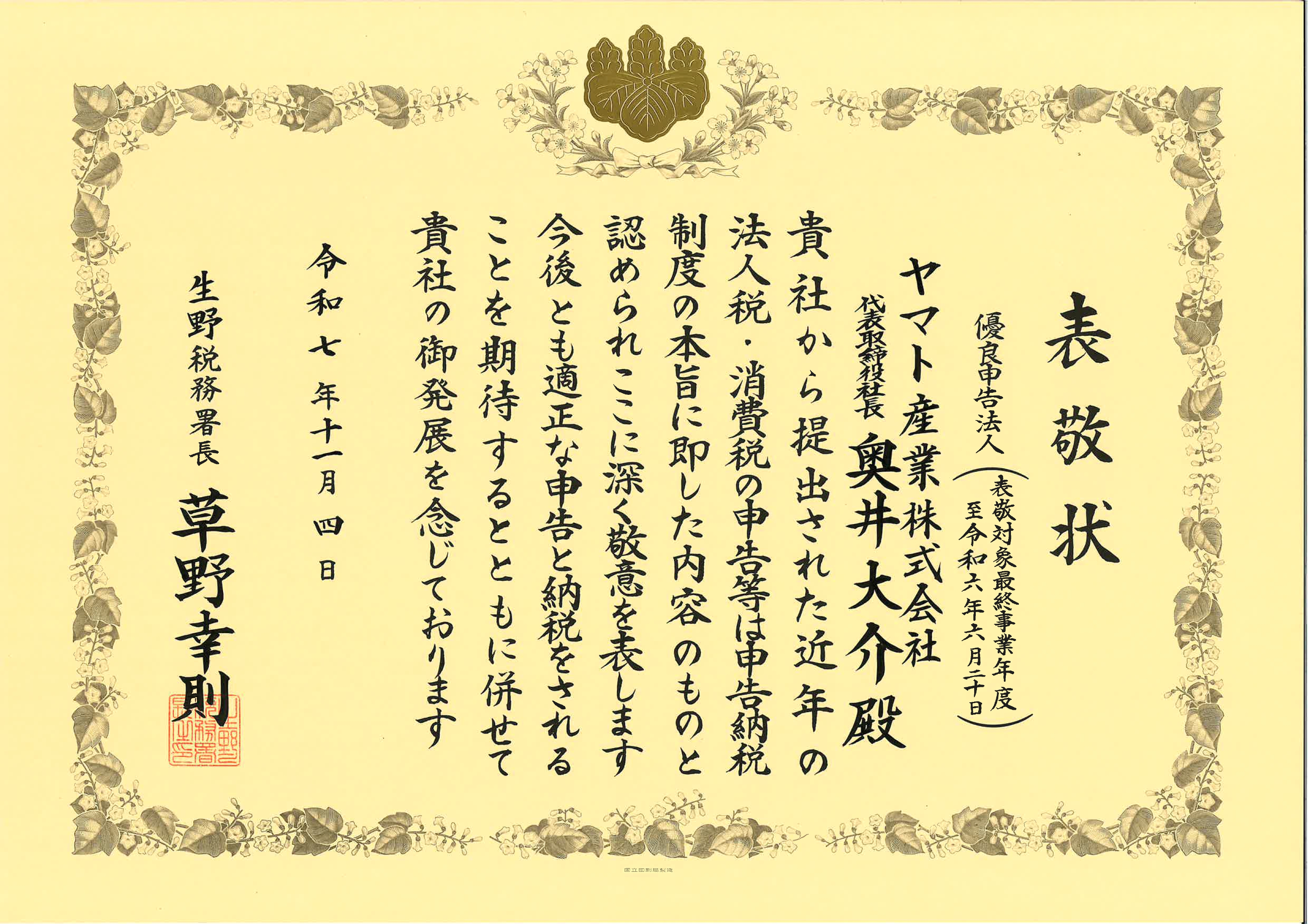 優良申告法人とは適正な申告と納税を継続して行っている法人として、税務署から表敬状を授与される制度のことです。 創業80周年の記念すべき年で、初めてこのような表敬を頂けたことを、大変光栄に存じます。
